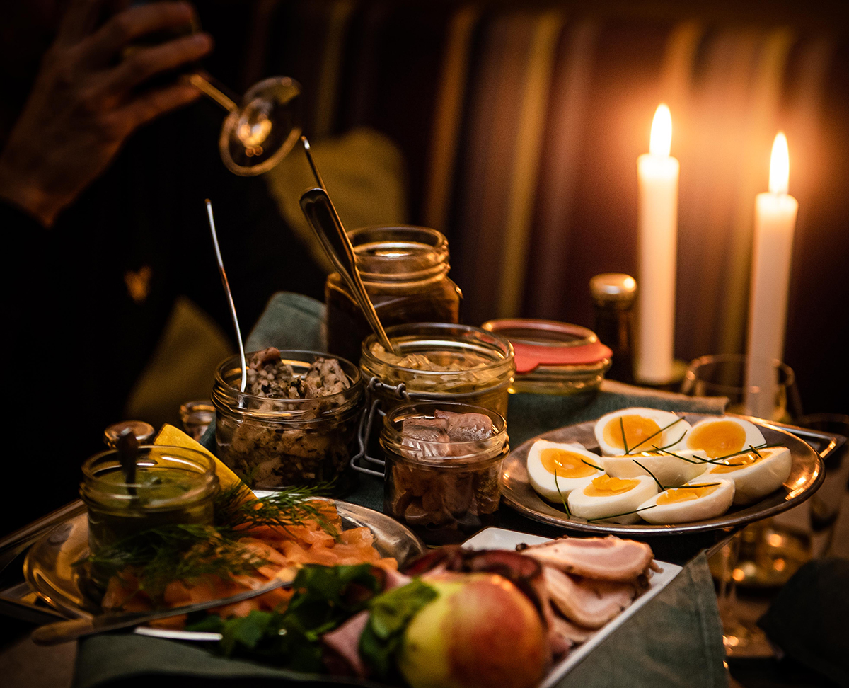 Fram dukas Kippers omtalade sillar, olika sorters lax, de magra syltorna, den grova hemlagade leverpastejen, revbensspjällen, de kryddpeppardoftande köttbullarna samt allt annat som vi tycker hör julen till. I år är julbordet berikat med ytterligare läckerheter, men är fortfarande ett riktigt gammaldags julbord.